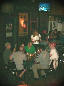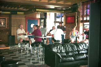 The front room offers seating at the bar and several cocktail tables, which have recently replaced the leather couch and the low-rider, cafeteria-style tables with their plastic red & white checkered tablecloths. If you’re looking for the couch in hopes of relaxing and watching your “Melrose Place” or “Beverly Hills 90210,” they’ve moved it upstairs and get a life. The front room has a four televisions, and an annoying SignCast TV next to the big screen. I believe all SignCast televisions should be banned, as they only show advertisements and bad videos that only regular patrons of the Gin Mill can appreciate (also owned by Hi-Tops proprietors). On the north wall, framed jerseys hang of Sammy Sosa, Ernie Banks, Kerry Wood, and a token Frank Thomas White Sox jersey. On the west wall, a nicely framed Budweiser sign hangs, which I believe, in addition to the Budweiser and Bud Light signs that hang on either side of the Hi-Tops logo (replacing the second story awning), is part of a contract between Budweiser and Hi-Tops to make Bud the beer of choice there. I wouldn’t be surprised if Bud and Bud Light cups and other promos become more commonplace. Miller fans beware. If you’re feeling restless, have a game of Golden Tee or pool (although sometimes covered up), which are across from the center bar on the south side of the room. The front room is also notable to my mind, as it was here that was my first time seeing a laptop in a bar. Sadly, I suspect it is not the last time.