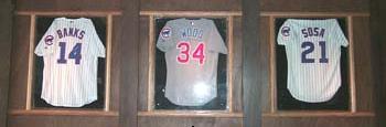 After about 10:00 p.m., the cocktail tables are cleared from the parkay dance floor to make room for the dancers. There is also an the elevated area behind the dance floor that is populated by low-rider tables by day and patrons at night that like to shake it high up, in front of the masses in the same spring break-like way they do at Beaumont’s every night until 4:00 a.m. Recently, bands have increasingly played at Hi-Top’s on this stage, like Jesse the Beaver on Wednesday nights. A long wooden bar serves dance floor patrons on the east side of the room, right in front of the kitchen. The room also features framed photos of Jim McMahon and Gale Sayers, and giant framed Ernie Banks, Stan Musial, Honus Wagner, Nellie Fox, and Frank Robinson baseball cards. The cards are located to the left of the bathrooms, where I once observed a group of guys timing how long there buddy urinated following a Cubs game. He kept a steady stream going for over a full minute. Very impressive (in its own way).