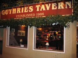 Once inside, you’ll find yourself opposite a wooden bar that runs the length of the western wall in the front room, which is tiled in laminated blue and beige. Guthries features a nice variety of about 40 microbrews, imports and blue collar specials, including La Fin du Monde, Chimay, a well-pulled pint of Guinness, seasonal offerings from the Sierra Nevada and Bells Breweries, Old Style and Hamm’s. Some of the above are featured on tap and all are nicely illustrated in a laminated, multi-page menu that also lists the varieties of wine, sangria and spiced apple cider available. Guthries does not feature a jukebox, so the bartenders play CDs pulled from a rather large stack behind the bar, found under a Mr. Potato Head and a stuffed mouse. It was here at the bar where I was once told the story of how a friend-of-a-friend picked up two femininas by saying, “You’ve been looking over here all night. How come you bitches aren’t over there talking to us?” Astonishingly, it worked. The high-backed, green-padded wooden stools fill up fast at the bar, so if you’re not quick enough to snag one of those, grab one of the two low-slung tables with checkered tablecloths, lamps and votive candles up front (this is where you’ll usually find me). There’s also a series of thick wooden cocktail tables along the eastern wall, below wooden shelving filled with books and an interesting variety of kickshaws, and from which hang string lights and the tavern’s collection of ceramic beer mugs. Though there are a few ceiling fans, they do little to clear out the smoke, which is one of the few criticisms people have of Guthries.