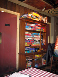 In-between the maroon and forest-green painted doors to the ladies’ and mens’ rooms, respectively, in the backroom, is a bookcase that stretches from floor to ceiling that is choked with a vast array of board games that would make those at Newport Bar & Grill envious. There you’ll find all your favorites, including Boggle, Monopoly, Risk, Scrabble, Yahtzee, Pictionary, Uno, Clue, Balderdash, Chutes and Ladders, Scattagories, Don’t Break the Ice, Connect Four, Checkers, Battleship, Operation (particularly interesting after a few drinks), and Candyland. Now that we are adults (ahem), you’ll also find Dirty Minds, Marry, Date or Dump, What If… and the game my wife first encountered at Guthries and now one that I have to endure on a semi-regular basis, Battle of the Sexes. We once played Jenga at Guthries and found that many of the wooden tiles had little questions and ditties, like “What is the definition of ‘teabagging’?” and “What is Bob Dylan’s real name?” I later lost $5 after betting that my friend couldn’t put another tile on the stack. Though he has little coordination or athletic ability, he surprised me in this accomplishment, just as he did when he successfully bowled a strike from the seats at the now-defunct Marigold Bowl when I bet him $20 that he couldn’t. It turns out that, whenever a wager is on the line, he develops obscure superhuman abilities designed to part me from my money. I should have known better as this is a guy that once broke up with a girl because she liked to dine in restaurants too much. On another occasion, we played Trivial Pursuit with one pie too few so we had to tear off part of a matchbook. As luck would have it, I got stuck with the “matchbook pie” along with the most slices, which found their way all over the board whenever someone rolled the die. We also played the Genus 2000 Edition, which asked some bizarre questions – one of the answers was the country of Eritrea. Enough said.