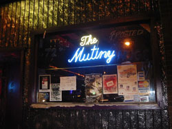 “Ok, after spending a Friday night at the Mutiny I have to admit that there are some fucking perks to this crazy place. Perhaps, the fact that Ed will allow you to try to fuck in the phone booth is one of them. Maybe, the fact that you can bang for thirty minutes in the ladies room is one of them, but probably the fact that all the guys are trashy and will bite you like the slut-whore you are is the best part–even when the bands are shitty.”