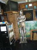 Across from the bar is a South Park pinball machine in northeast corner, next to three cork dartboards, a full-size knight’s armor that would make the Art Institute jealous, and a cigarette machine. A jukebox features punk and harder-edged alternative, including many of the bands that have played there, and stands next to a battered wooden phone booth with newspaper clippings covering the bar taped to it. A little further down are a pair of one-seater bathrooms, though they tell me the women’s is surprisingly clean and spacious, though the toilet may or may not be attached to the floor. A pool table lies just beyond and, like the darts and Golden Tee, it’s free. The air was once quite smoky in Mutiny, but the smoking ban has not only cleared all that out, but also some of the bar’s patronage to casinos and bars just over the border in Indiana.